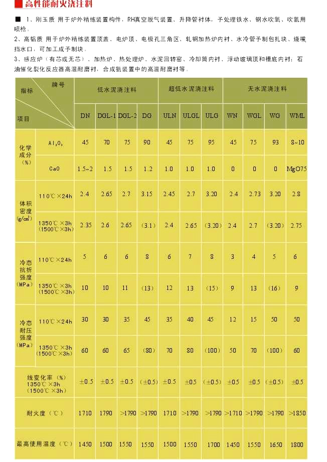 昌達耐材生產(chǎn)的低水泥澆注料、超低或無水泥澆注料用與主材質(zhì)化學(xué)成分相同或相近的超微粉取代大部分或者全部水泥,精致、科學(xué)運用優(yōu)化顆粒級配、微粉、顆粒形態(tài)等因素,同時加入微量的分散劑(減水劑)及適量緩凝劑等復(fù)合外加劑配制而成。低水泥澆注料主要用于冶金、電力、有色、石化、建材等行業(yè)。如玻璃窯槽底、水泥窯前后窯門罩冷卻機前端等耐高溫部位、前后窯口、噴煤管等;加熱爐、均熱爐等各種熱處理爐;中頻感應(yīng)爐內(nèi)襯、石油化工催化裂化反應(yīng)器的高溫耐磨襯里、其它工業(yè)爐窯襯里。可采用現(xiàn)場澆注、涂抹和搗打的施工方式。