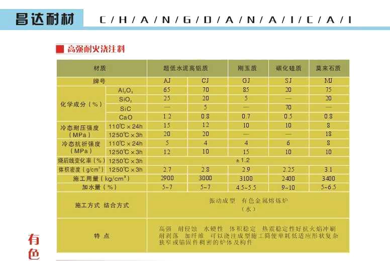 1、水泥用量低,澆注料中含鈣量?jī)H為傳統(tǒng)耐火澆注料的1/4-1/3。因此,減少了低水泥澆注料中低熔相的數(shù)量,從而使高溫性能能明顯改善;